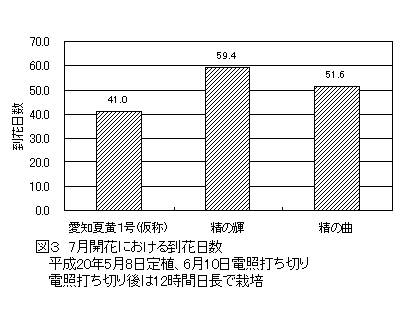 到花日数は「精の輝」より2~3週間、「精の曲」より1~2週間早い(図3)。自然日長下においても7週以内に開花する。 |