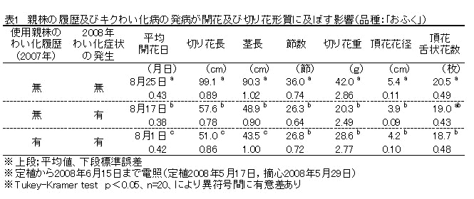 キクわい化病発病株は、電照による開花調節が不可能で切り花栽培ができず、次作でも100%発病する。また、外観が健全な株でも発病が確認された品種ではキクわい化ウイロイドが検出される。 | ||||||||||