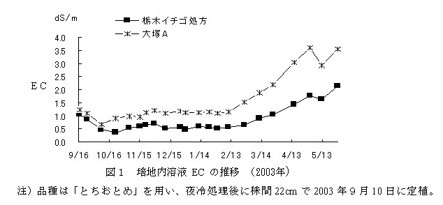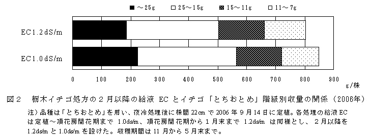 大塚A処方の硫酸態硫黄濃度を1/2とした「栃木イチゴ処方」は、2月以降の培地内のEC上昇が抑制され、収量性も向上し、クリプトモスを培地とする閉鎖型養液栽培に適する。2月以降のEC管理は1.0dS/mとすることが適当である。 | ||||||||