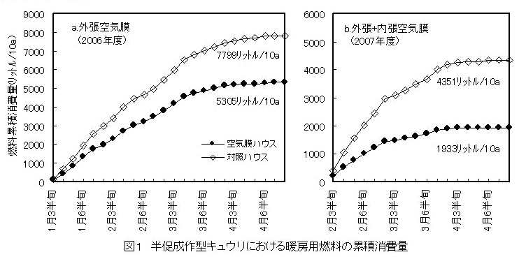 キュウリの半促成作型において、外張空気膜ハウスの内張りを間欠方式の空気膜で被覆し、内張りの妻面と側面にサニーコートを被覆する(以後「外張+内張空気膜ハウス」と略記)と暖房用燃料削減率は対照ハウスと比較して、55%まで高まる(図1・b)。 |
