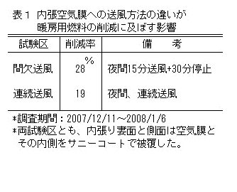 内張りに空気膜を利用する場合、空気膜内への送風を夜間連続的に行うと暖房用燃料の削減効果はやや劣るので、送風方法は削減効果が30%弱まで高まる15分送風と30分停止の繰り返しの間欠方式とする(表1)。 |