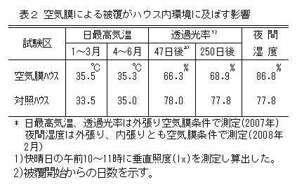 空気膜の導入コストは、初期コストとして外張りの場合650千円/10a程度必要で、費用対効果を計算すると3年程度被覆資材等を連用することが必要である。内張りについては、今回供試した資材は試作品である。 |