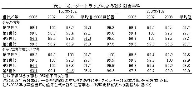 チャノコカクモンハマキのモニタートラップによる誘引阻害率は、250本/10a区ではすべての年次、世代で95%を上回るが、150本/10a区では第2世代(2006年)または第3世代(2006年、2008年)で95%を下回る場合がある(表1)。 |