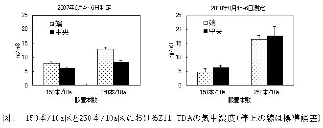 ハマキガ類の交信攪乱剤(トートリルア剤)の150本/10a設置では、250本/10aに比べて主要成分のZ11-TDAの気中濃度は薄くなり、交信攪乱効果もやや不安定である。 |
