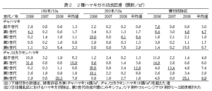 チャハマキとチャノコカクモンハマキの幼虫密度は年次や世代によって大きく変動し、150本/10a区、250本/10a区、および慣行防除区間では、有意な差は認められない(p>0.05)(表2)。なお、幼虫密度は、薬剤防除の影響が大きいと考えられる。 |