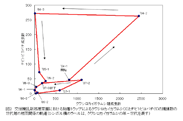 さらに、葉層下に吊した黄色粘着トラップに捕獲された世代毎のクワシロカイガラムシの雄成虫数(X)とチビトビコバチの世代毎の捕獲数(Y)との関係を世代毎にプロットすると、振幅の大きい左回りの軌道を示す(図2)。このことは、チビトビコバチはクワシロカイガラムシの密度抑制要因として機能していることを示唆する。