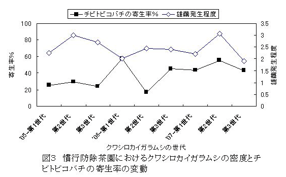 一方、同じ地区の慣行防除茶園において延べ9世代にわたってクワシロカイガラムシの密度とチビトビコバチの寄生率の経時的変動を調べた結果、寄生率は一時的には60%程度まで上昇したが寄主密度には大きな低下は認められない(図3)。