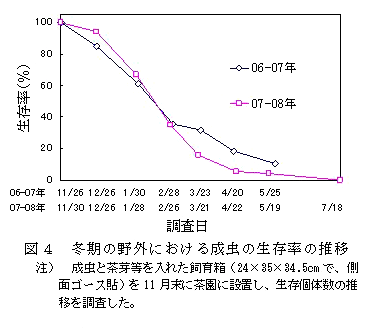 マダラカサハラハムシ成虫による茶の被害が一部地域で常発している。これまでの本種による被害特性は観察による記述が多く詳細な記録が無いため、被害特性を明らかにし防除対策を確立するための基礎資料とする。 | ||||||||