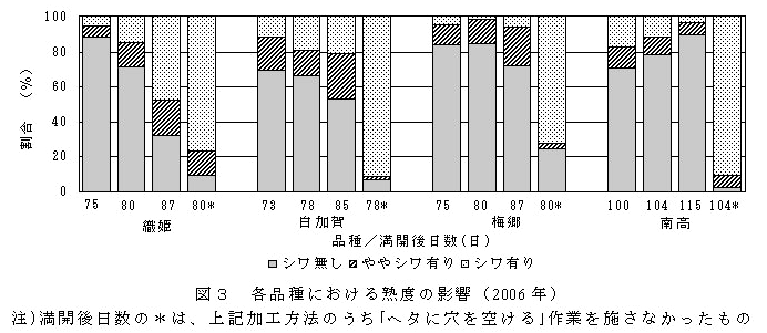冷凍させたウメのヘタに穴を空け、砂糖漬けすることにより、シワにならない砂糖漬け梅を作ることができる。「織姫」「白加賀」「梅郷」は未熟な果実を用いた方がシワになりにくく、「南高」は熟度が進んでもシワになりにくい。 | ||||||||||