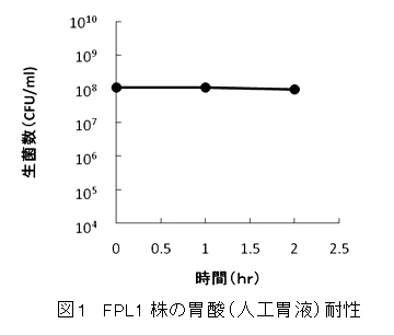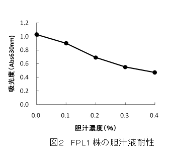 選抜したFPL1株は、人工胃液中(100mM HCL/KCl buffer pH2.0 with 0.04% Pepsin, 37℃, 2hr)における生菌数の低下はなく、また、0.4%胆汁末含有GYPブロスでも生育可能で、胃酸・胆汁耐性が共に高い(図1、図2)。