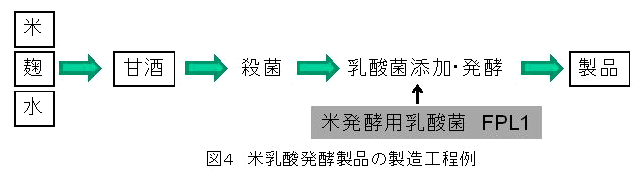 この乳酸菌を使った米の発酵は、米に麹を加えて糖化させた甘酒を加熱殺菌して、乳酸菌を添加する方法(図4)が適しており、再現よく乳酸発酵を行うことができる。 |
