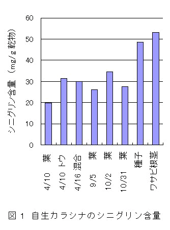 佐渡産の自生カラシナには、辛み発現の元となるシニグリン含量が春期(4月)から秋期(9、10月)の自生カラシナ中に20mg/g乾物以上含まれ、辛みを発現させるのに十分な濃度である(図1)。 |