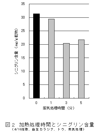 加熱処理時間が長いとシニグリンが失われる傾向にあり(図2)、処理時間が不十分であると葉の蒸気処理の場合のように乾燥中の褐変等により乾燥品のクロロフィル含量が低下し、品質が悪くなる(表1)。 |