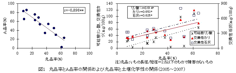 現地(行方市)において調査した結果、A品率と丸品率には高い負の相関が見られる。また、丸品率が高い圃場は、作付前土壌の可給態リン酸、交換性カリ、交換性石灰含量が多い傾向が認められる(図1)。このため、A品率を高めるには各分析項目が著しく高くない圃場を選定する。 |