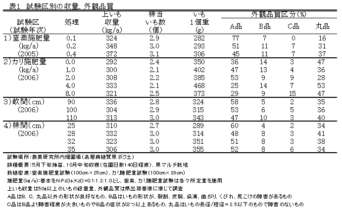 畝間、株間の違いによる収量差は判然としないものの、広くなると丸品あるいは障害いもの発生が多くなり、A品率は低下する。そのため栽植密度は畝間90cm、株間25cm程度の密植とする(表1)。 |