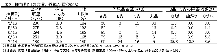 5月中旬~6月中旬までの挿苗は収量に差はほとんどみられない。しかし、6月30日以降の挿苗では収量は低下し、さらに皮脈、曲がり等の障害いもが増加する。このことから、挿苗は6月中旬までとする(表2)。 |