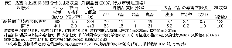 土壌化学性による圃場の選定、窒素およびカリ施肥量、栽植密度、挿苗期、4節植えを組合せて現地実証試験をした結果、丸品、曲がりおよびくびれ等の障害いもの発生が少なくなり、A品率と粗収益が向上した(表3)。 |