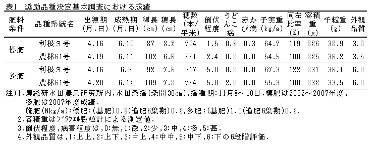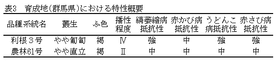 「利根3号」(平成20年群馬県育成)は「農林61号」と比較して、次のような特徴があるので認定品種に採用する。 | ||||||||||