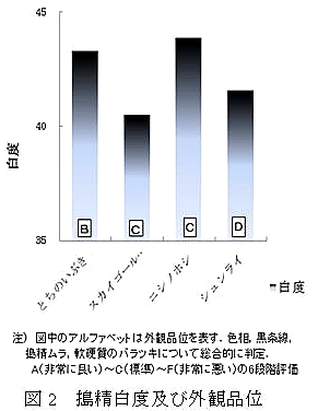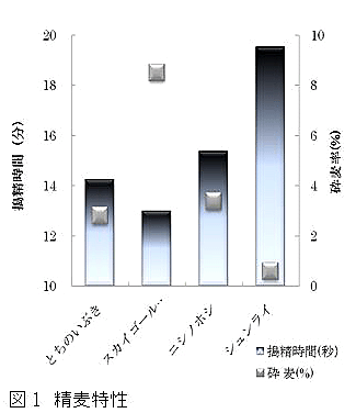 55%搗精時間はやや長いが、砕粒率は低く搗精白度は高い(図1、2)。 |