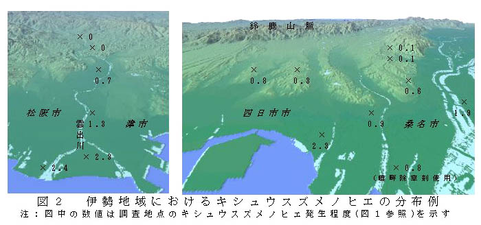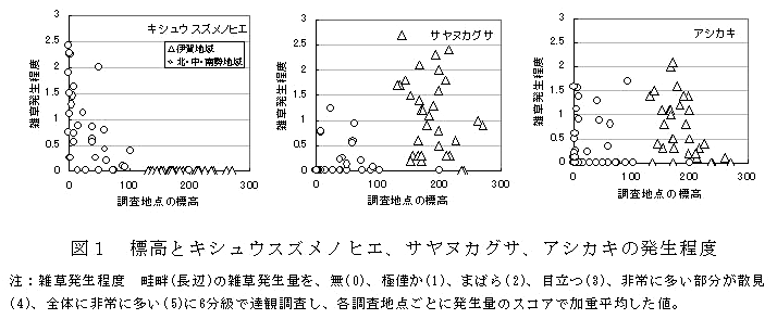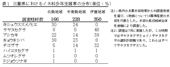 キシュウスズメノヒエは海岸付近の水田に多発し中山間地域には少ない。サヤヌカグサは伊賀地域に多く、伊勢平野の海岸付近ではほとんど見られない。アシカキは地域条件に関係なく分布する。 | ||||||||