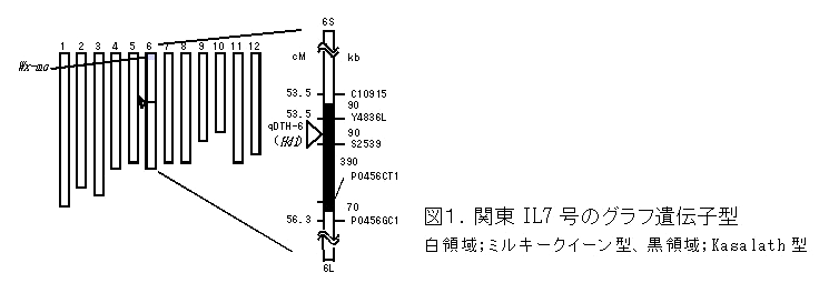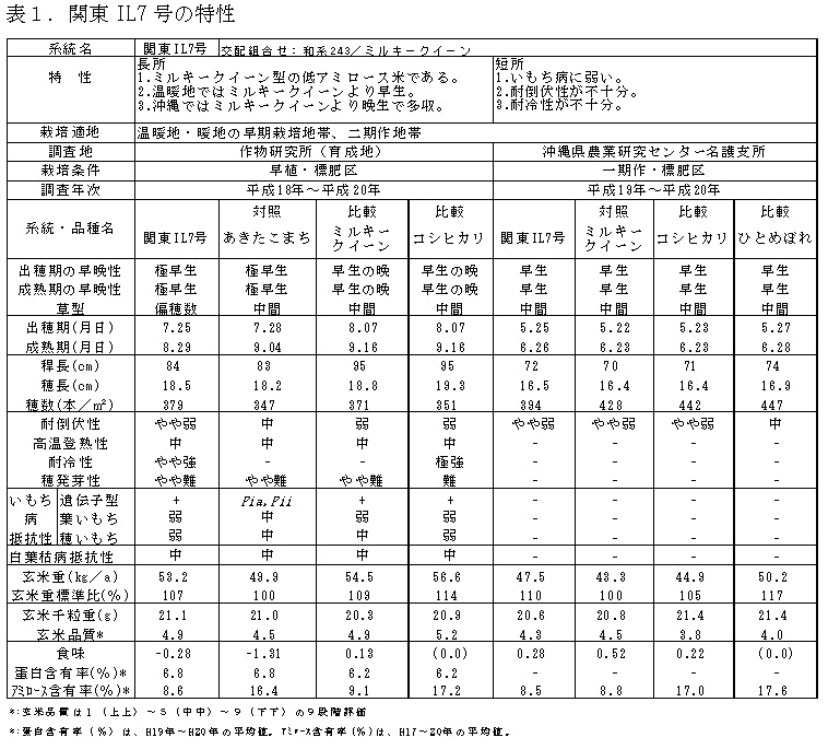 「関東IL7号」は、「ミルキークイーン」の遺伝的背景に出穂遺伝子 Hd1を含むインド型品種「Kasalath」の染色体断片約560kbを有する低アミロース米系統である。出穂性は、「ミルキークイーン」と比較して関東では早生に亜熱帯環境では晩生になる。 | ||||||||||||||||||||||