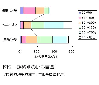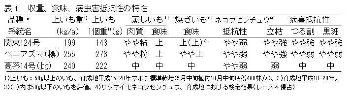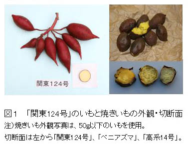 サツマイモ「関東124号」は、肉質がやや粘質でしっとりとしていて、良食味である。調理後の肉色は鮮やかな黄色である。「ベニアズマ」「高系14号」よりも収量は少ないが、いもが小さく、食べきりサイズの200g以下いも収量は多い。両品種より病害に強い。 | ||||||||||