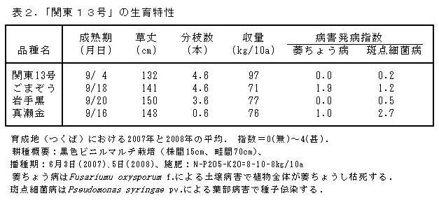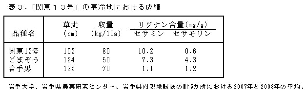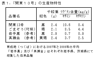 黒ごま「関東13号」はセサミンを多く含み、草丈が低くやや多収である。病害や寒さに強く寒冷地でも穫れる。 | ||||||||||
