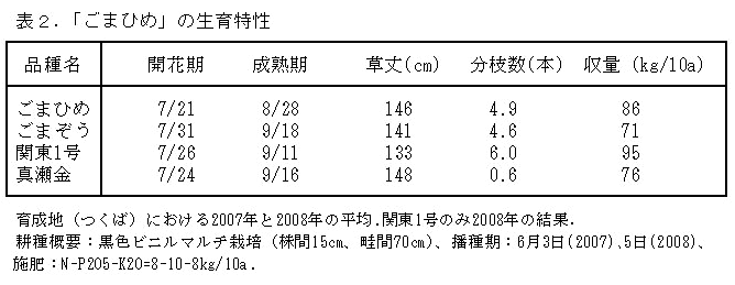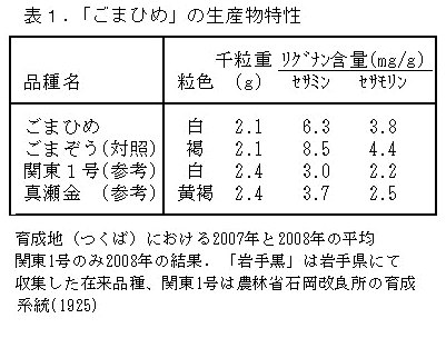 白ごま「ごまひめ」はセサミンとセサモリンを多く含み、早生で収穫期が早い。 | ||||||||