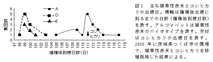 [キーワード]雑草イネ、出穂期、芒、ふ先色、籾色、脱粒性、圃場調査 |