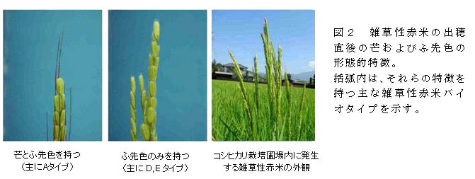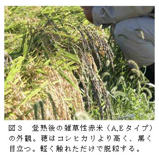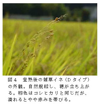 雑草性赤米は、コシヒカリの約10日前?同日前後に出穂し、その穂はコシヒカリより5?30cm高く位置し、出穂直後は、赤い芒・ふ先色をもつ。登熟に伴い自然脱粒し、収穫期には穂が立ち上がる。登熟した穂は濡れると赤みを帯び、コシヒカリと見分け易い。 | ||||||||||