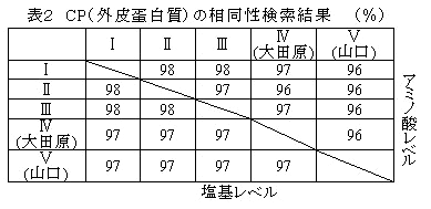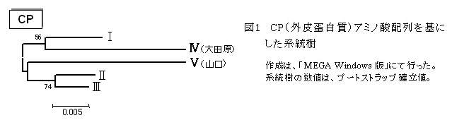 大田原系統は、ウイルスゲノムの塩基およびアミノ酸配列の相同性検索の結果、外被蛋白質(以下CP)は山口ほ場で採取されたⅣ型(岡田ら2006)と100%一致し(データ省略)、既知のⅠ~Ⅲ型と一致しなかった(表2)。このことから、大田原系統はⅣ型である。 |