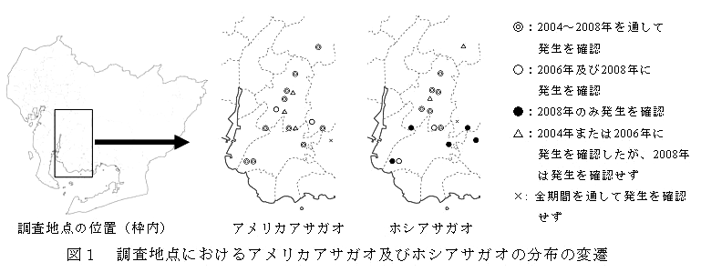 アメリカアサガオは、2004年から2006年にかけて2地点が加わりほぼ全域の15地点で発生が確認され、2006年から2008年にかけて3地点で消滅したが、発生地点数は依然として多い(表1、図1)。 |