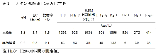 本研究に用いた消化液は、本県に2008年に竣工したバイオガスプラントと同様に、主原料として固液分離した牛ふん尿の液分を使用してできたものであり、両者の性質および成分は類似している。 |