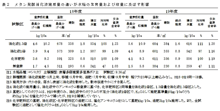 代かき、落水後に化学肥料と同量のアンモニウム態窒素を含む消化液を施用して再代かきすることにより、化学肥料と同等の生育ならびに同等の玄米収量が得られる(表2)。また、消化液を1.3倍施用すると、無効分げつの増加、玄米窒素含有率の増加、倒伏の危険性が高くなる傾向がある。 |