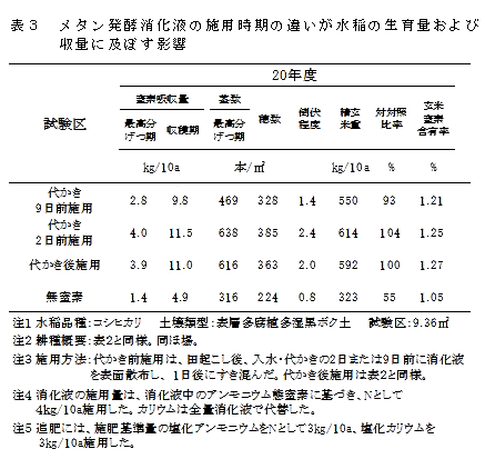 消化液を代かきの2日前に施用すると、代かき後施用と同等の生育および収量であるが、代かき9日前施用では、生育量および収量はやや減少する(表3)。肥料効率の面から、代かき前に施用する場合、代かき直前の施肥が望ましい。 |