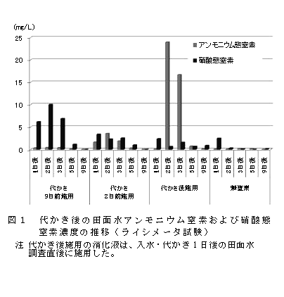 水稲栽培期間中の田面水の硝酸態窒素濃度は、代かき9日前施用で高くなる(図1)。このことから、生育量および収量の減少は、アンモニウム態窒素の硝化ならびに引き続く脱窒による影響と考えられる。 |