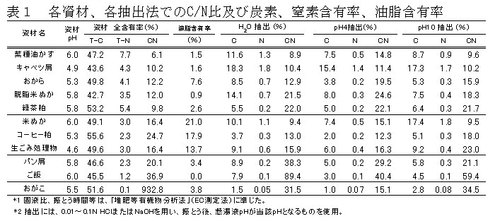 各pH溶液で抽出される水溶性の炭素窒素成分の比(抽出性C/N比)は、全量分析で求めた資材C/N比と異なるものがあり、パン屑、米飯屑等の炭水化物系資材で高くなる傾向にある(表1)。 |
