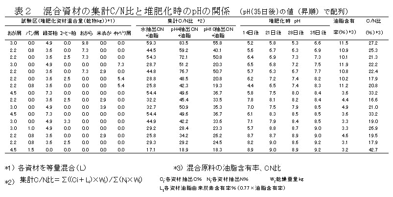 各食品廃棄物のpH4抽出液の炭素含有量、窒素含有量と油脂含有炭素量から算出したC/N比(集計C/N比)は、当該材料の混合堆肥化時pHとの相関関係が高いため、堆肥原料の集計C/N比で事前に堆肥化時pHを推定することで、効率的な堆肥化が可能である。 |