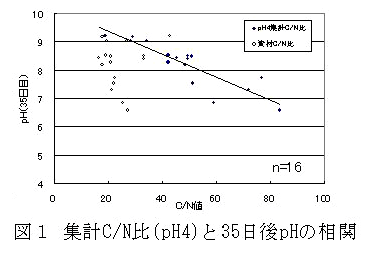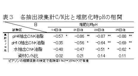 集計C/N比と各種食品廃棄物堆肥化時のpHの相関係数は、pH4抽出液の炭素、窒素含有率を使用した場合に高い値となり、pH4抽出集計C/N比と35日目pHで最も高い。このため、pH4集計C/N比は、一定期間経過後の堆肥化時pH推定に使用できる(表3、図1)。 |