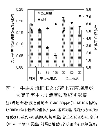 牛ふん堆肥施用量の増加に伴い、大豆子実中Cd濃度が低下する。また、牛ふん堆肥施用による子実中Cd濃度の低下は、苦土石灰により土壌pHを同程度の高さに矯正した場合よりも大きいため(図1)、堆肥によるCd吸収抑制のメカニズムはpH矯正による吸収抑制効果だけでなく、その他の要因も関わっている。 |