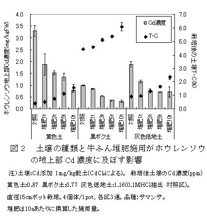 牛ふん堆肥施用量の増加により土壌全炭素含量が増加し、ホウレンソウ地上部Cd濃度が低下する。土壌の種類別では黄色土、灰色低地土、黒ボク土の順に地上部Cd濃度が高く、全炭素含量の高い黒ボク土では他の土壌に比べ低い(図2)。 |