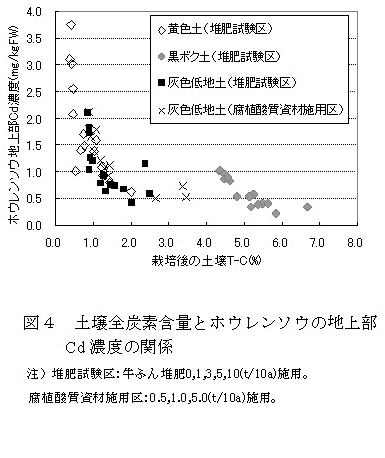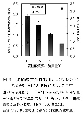 腐植酸質資材施用量の増加により土壌全炭素含量が増加し、ホウレンソウ地上部Cd濃度が低下する(図3)。 |