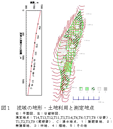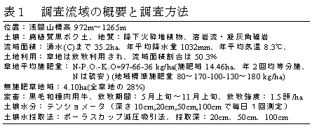 傾斜地に多い草地では、立地する地形ごとの窒素養分の流出が解明されると、地形連鎖のもつ自然浄化機能を活用した汚濁負荷低減が可能となる。しかし、複雑な地形で構成される山地傾斜地では、その流域地形の上流域から湧水までの土壌水中の養分負荷の実態は明らかではない。そこで、放牧草地が広い面積を占める火山麓草地流域内の尾根・谷の地形において施肥、無施肥に対応した土壌水中の硝酸態窒素に着目しその流出実態を解明する。調査地は黒ボク土壌からなり流域中央に谷のある御代田流域である(表1、図1)。 |