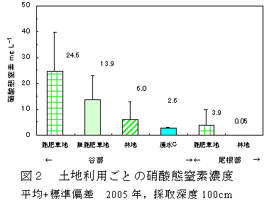 流域の土壌水中100cm深の硝酸態窒素濃度は、谷部に位置する施肥草地、無施肥草地、林地の順に低下し、湧水部での変動は少なくもっとも濃度が低い(図2)。すなわち、施肥される窒素は地域標準量である(表1)が、谷部施肥草地での濃度は25mg/Lと高い。しかし、無施肥草地では14mg/L、林地では6mg/Lと低下する。さらに湧水の濃度は2.6mg/Lと低くなる。一方、尾根部の施肥草地では4mg/Lで谷部の林地より小さく、尾根部林地では0.05mg/Lと低い。 |