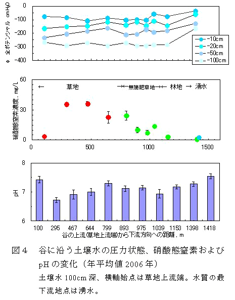 谷に沿う土壌水の動きは、降雨により10~100cm深までポテンシャルが下流方向に増加し高いこと(図4上)から、下方へ雨水の浸透が進むとともに尾根斜面から土壌水が集まり土壌水分が増加することをしめす。谷に沿う硝酸態窒素濃度は、施肥草地の下流側で増える(図4中)が、これは周囲の尾根斜面および谷上流から硝酸態窒素濃度の高い土壌水の移動があることを示す。また無施肥草地では、施肥草地との隣接部ほど硝酸態窒素濃度が高く、上流からの移動があることを示す。 |