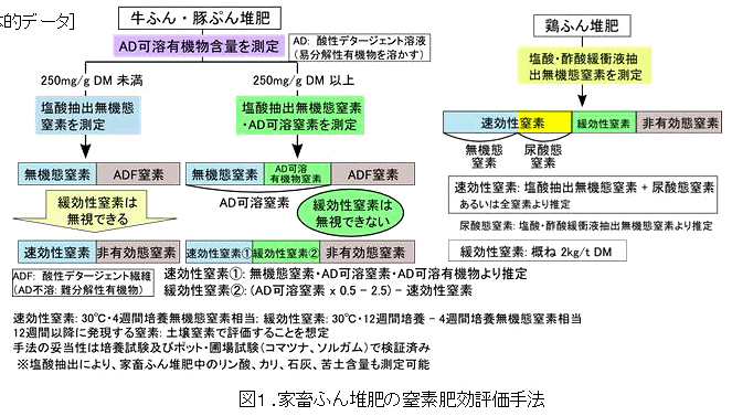 この分析法では、牛ふん、豚ぷん堆肥では簡便化した酸性デタージェント(AD)抽出液等、鶏ふん堆肥では塩酸抽出液等の分析により、速効性(施用直後~4週間)、緩効性(施用4週間後~12週間後)を区別して窒素量を算出する(図1)。分析は高価な機器を使用せずに2日程度で可能である。 |