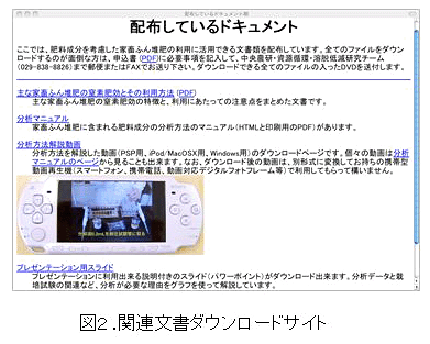 堆肥の肥効評価法マニュアルでは、携帯型動画再生装置で利用可能な分析操作・手順の字幕入り動画、分析結果に基づく施用方法の解説資料等が用意され、人員・予算に制限がある普及センター等での利用が可能である(図2)。 |