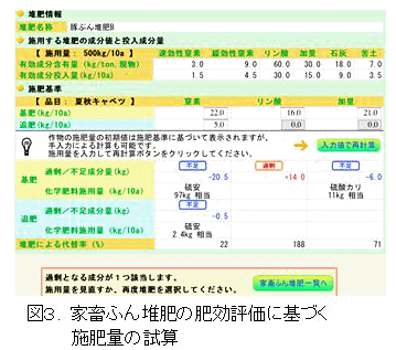全国から集めた610点の家畜ふん堆肥の分析値、水稲、キャベツの施肥基準、地温をデータベースに持ち、サーバ上で稼働する施肥設計システム(名称:堆肥カルテシステム)を構築し、体験版として公開する。利用者は家畜ふん堆肥の肥効評価に基づいた施肥設計をWebブラウザ上で体験できる(図3)。データベースに無い堆肥、作物での施肥設計は分析値、施肥基準の入力により可能になる。 |