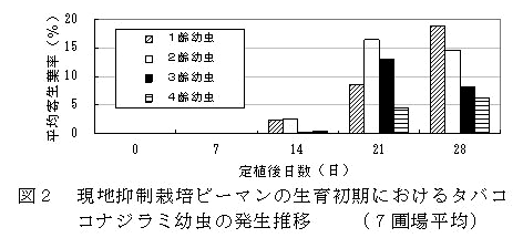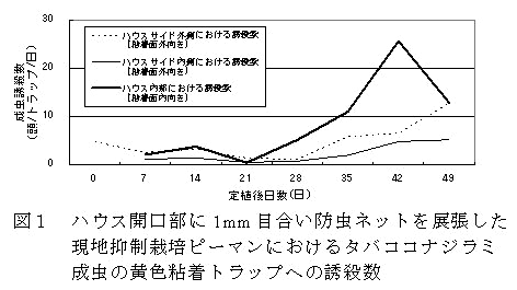 抑制栽培ピーマンにおいて、定植時にはすでにハウス周辺でタバココナジラミが発生している。1mm目合いの防虫ネットでは成虫がハウス内に侵入し、定植の約1か月後から増加する(図1)ことから、放飼時期の遅れがタバココナジラミの密度を抑制できなかった原因の一つであると推察される。 |