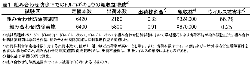 トルコギキョウのウイルス病防除に有効な個別技術を体系化した「トルコギキョウのウイルス病対策マニュアル」に準じ、図1に示した組み合わせ防除を実施するとウイルス病害が防除でき、前作でIYSVおよびLiNSVの混発により出荷株割合(出荷本数÷定植本数)は約0.3であったのに対し、実施後は前作の約3倍に向上し、生産者の粗収益も増加した(表1)。 |